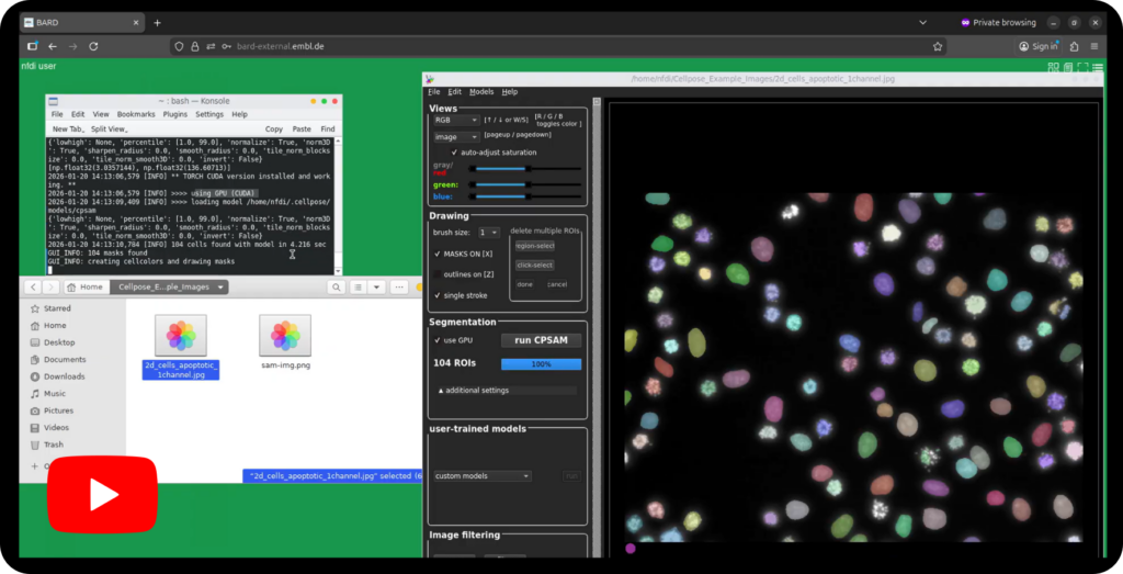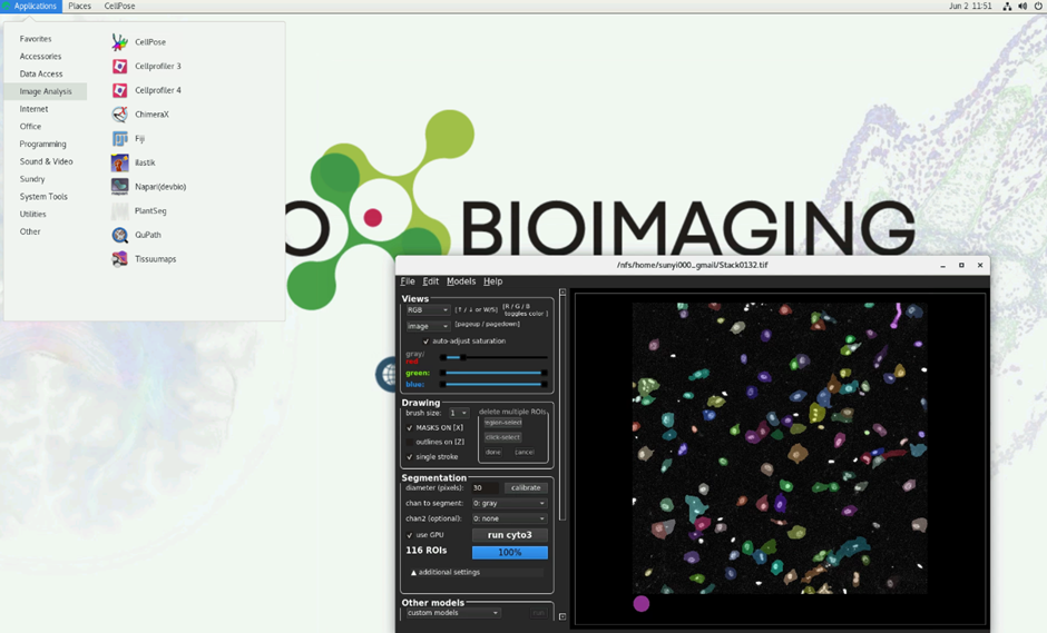 5. Start your application of choice by clicking its icon in the bottom dock (for example Cellpose-SAM as in our video tutorial example). Off you are for your analysis. Additional applications can be accessed from the menu in the top-right corner.